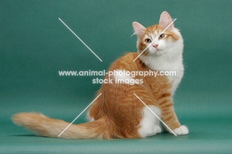 Siberian on green background, Red Mackerel Tabby & White, sitting