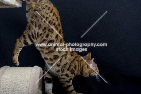Bengal male cat walking down from a scratch post
