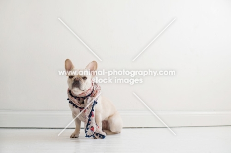 French bulldog in front of white wall wearing scarf.