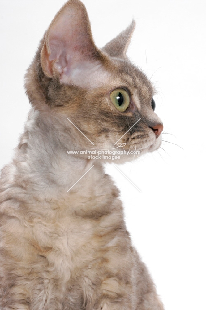 Devon Rex, Blue Mackerel Torbie, shoulders up