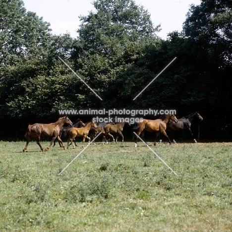group of westphalian warmblood mares and foals trotting off