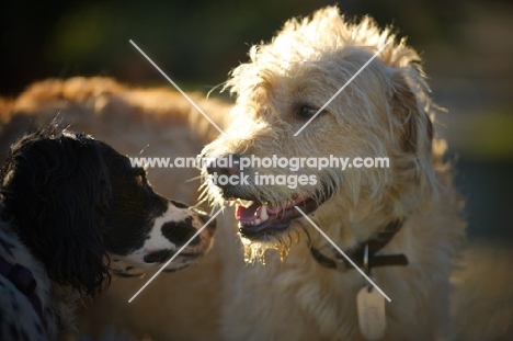 english springer spaniel smelling a lagotto romagnolo and labrador cross