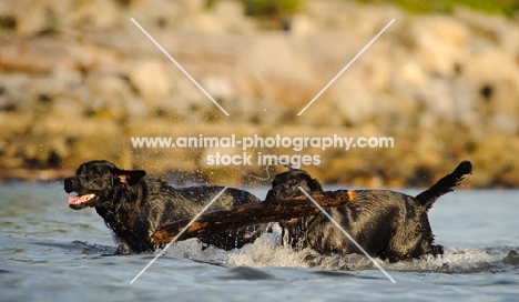 two black Labrador Retrievers in water