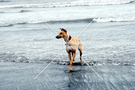 Lurcher on standing in sea, all photographer's profit from this image go to greyhound charities and rescue organisations