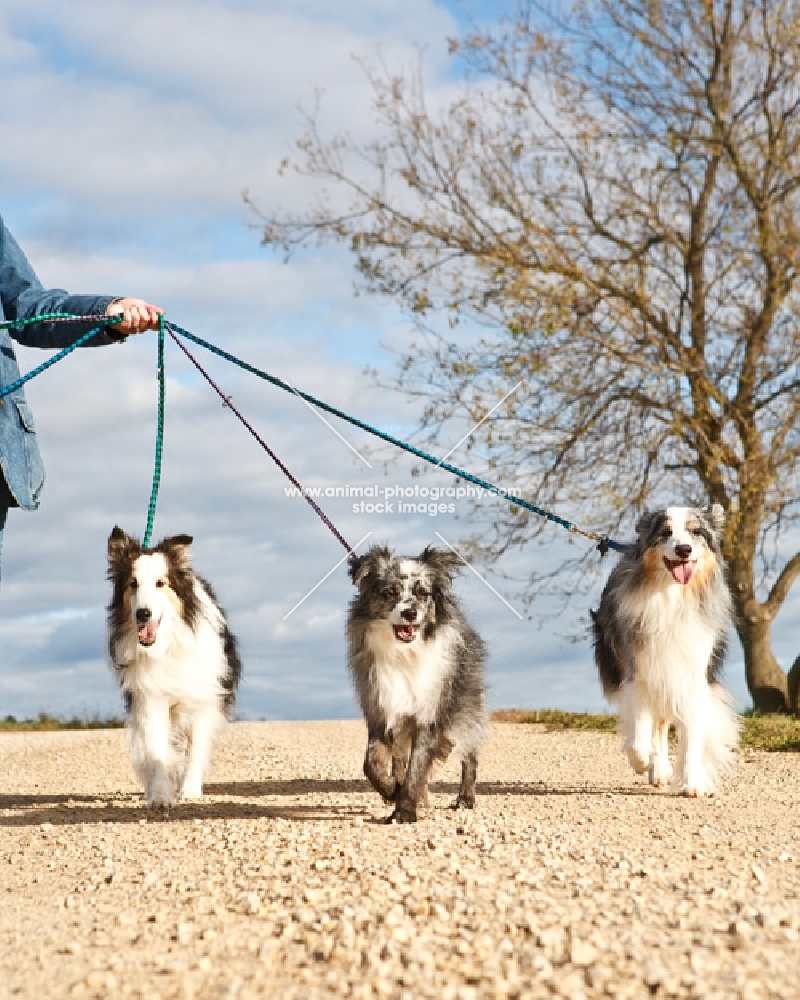 Shetland Sheepdog, Australian Shepherd (miniature) and Australian Shepherd on lead
