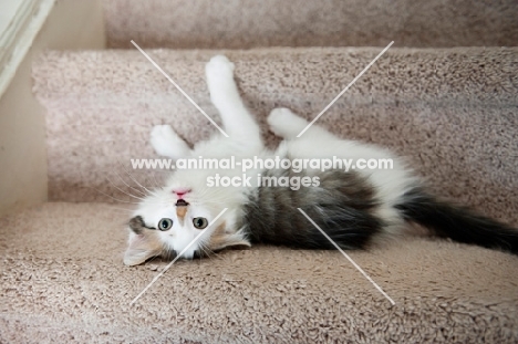 medium-hair kitten lying upside down on stairs