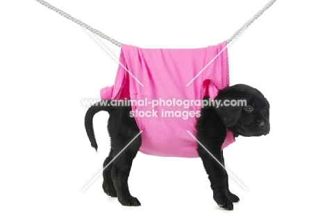 Black Labrador Puppy hanging on a washing line, isolated on a white background