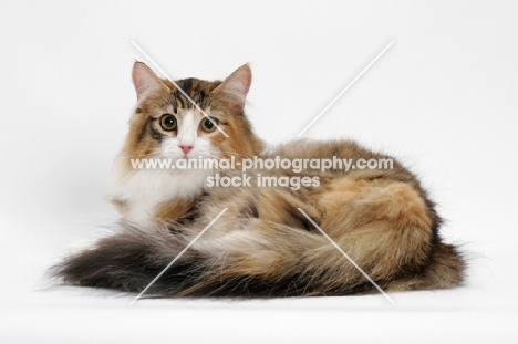 Brown Mackerel Torbie & White Norwegian Forest Cat, lying down