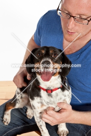 man with Dachshund x Beagle mix (also known as Doxle, Doxie, Beaschund)