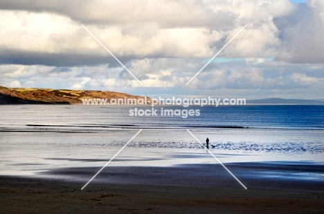 woman walking with 2 dogs on the beach at the Pembrokeshire coast in Wales