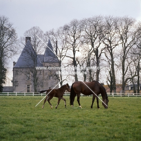 French Trotter mare with foal at Haras de Pompadour