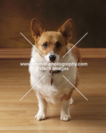 Pembroke Corgi standing on wooden floor