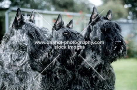 three scottish terriers together, head studies from gaywyn and mayson kennels