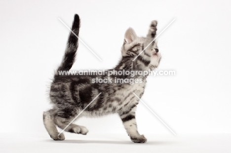 Silver Classic Tabby American Shorthair kitten, one leg up