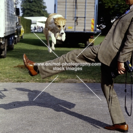 jennie loriston-clarke's lurcher jumping mr loriston-clarke's leg