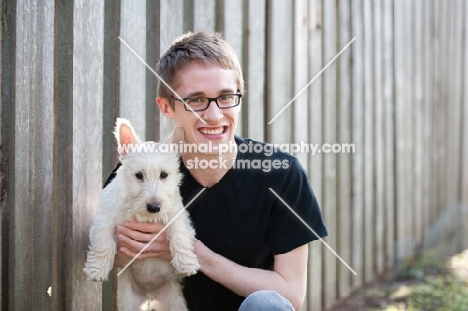 wheaten Scottish Terrier puppy being held by male owner outdoors.