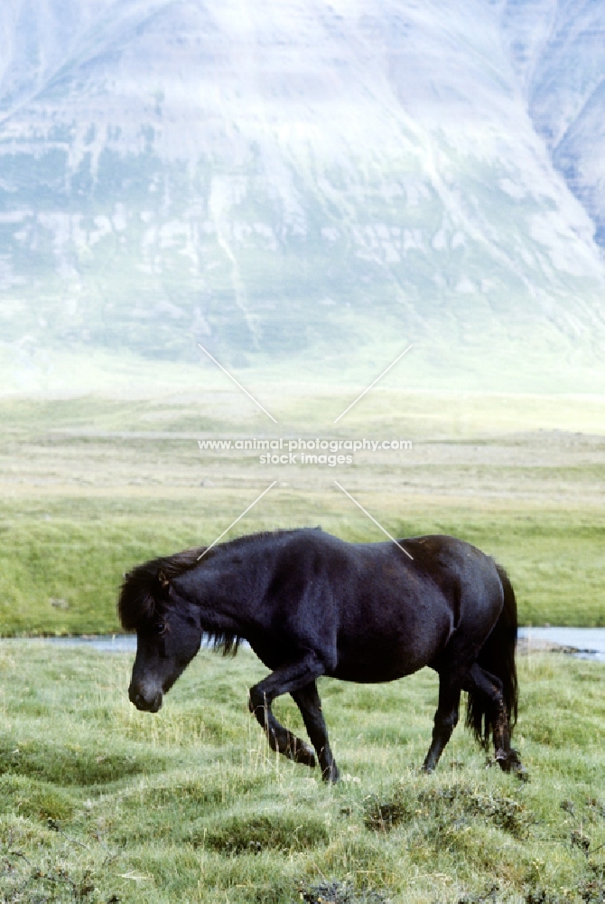 iceland horse walking in grassy lava field at sauderkrokur in iceland