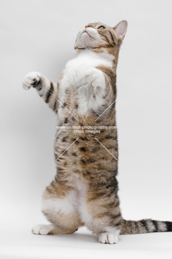 American Wirehair, Brown Mackerel Tabby & White, front leg in the air