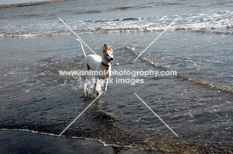 Lurcher on running out of the sea, all photographer's profit from this image go to greyhound charities and rescue organisations