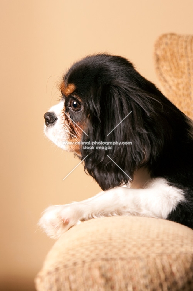 Side view of Cavalier King Charles spaniel lying on arm of sofa