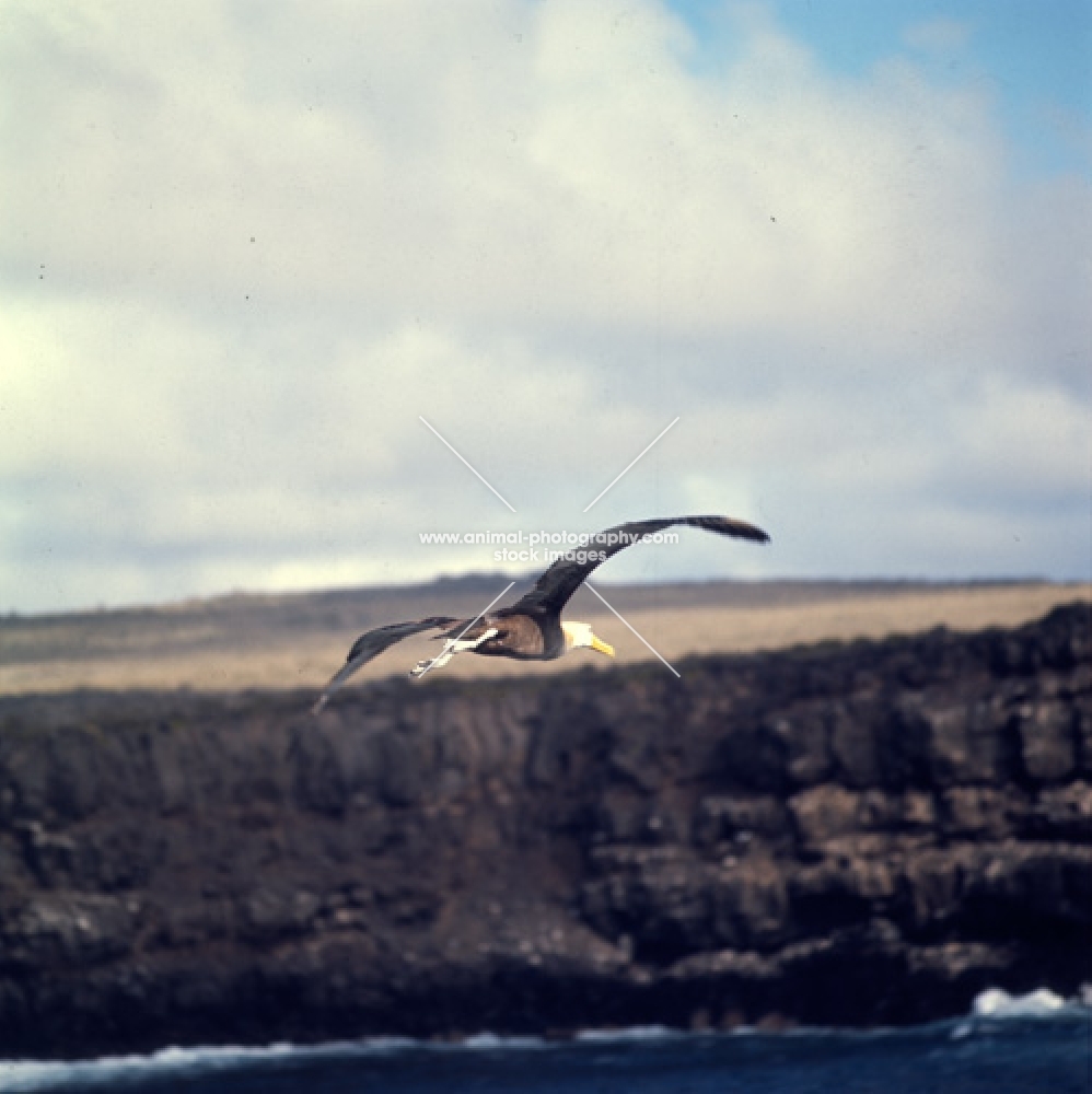 waved albatross flying towards hood Island, galapagos islands