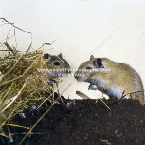two gerbils, agouti colour, on peat with hay
