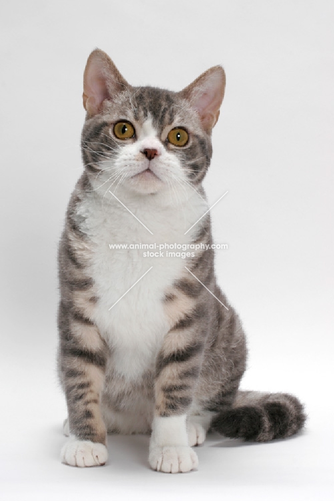 American Wirehair, Blue Mackerel Tabby & White colour, sitting down