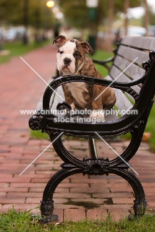 Bulldog pup on park bench