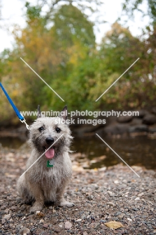 Happy wheaten Cairn terrier sitting in front of creek on rocks.