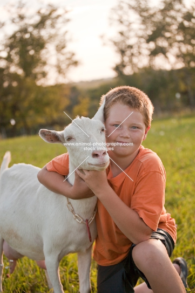 young boy with is beautiful white Saanen diary goat