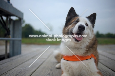 karelian bear dog resting on a dock and smiling