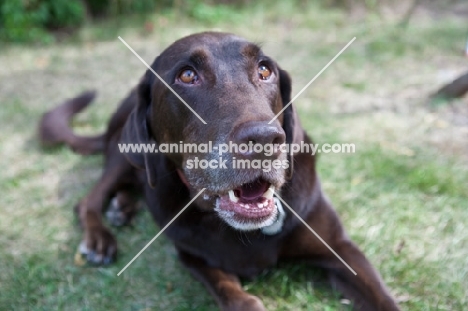 Chocolate Labrador Retriever with greenery background.
