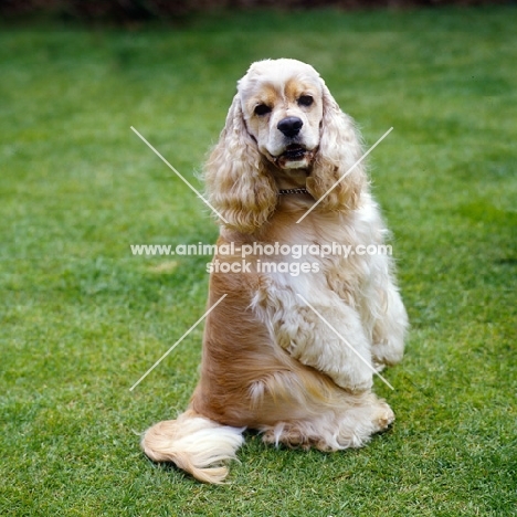 undocked american cocker spaniel sitting up on grass