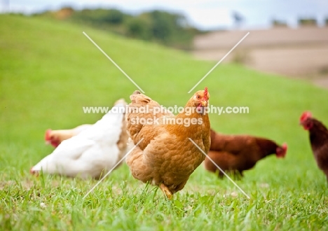 Flock of chickens in grassy field