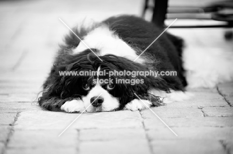 black and white of cavalier king charles spaniel lying with head down on pavement