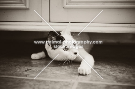 bi-coloured cat under cupboard