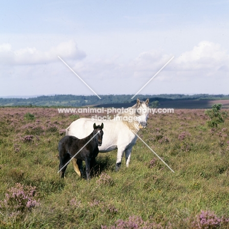 new forest mare and foal in heather in the new forest