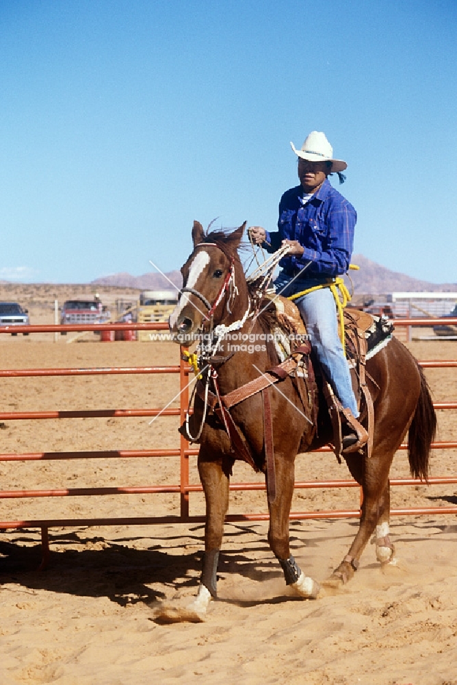 quarter horse and american indian rider at indian rodeo at mexican water, utah, usa