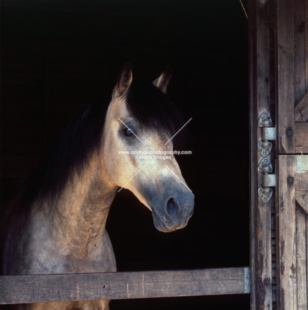 comet, welsh cob (section d) stallion looking out of stable
