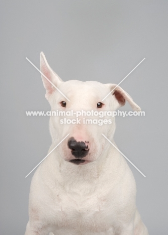 Bull terrier on grey studio background, one ear up