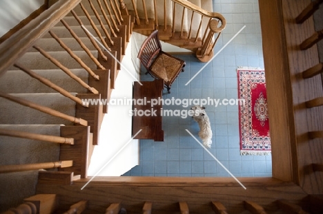 View of Cairn terrier on tile floor in home, taken from 2nd floor.