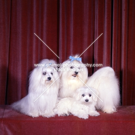 ch vicbrita delight, ch vicbrita fidelity, front, vicbrita petit point two maltese and puppy sitting on velvet
